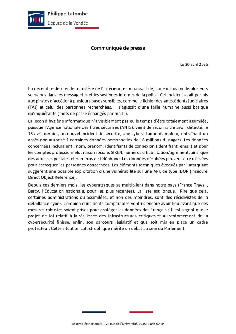 Le député Philippe Latombe communique sur la cyberattaque contre l'Agence nationale des titres sécurisés (ANTS)