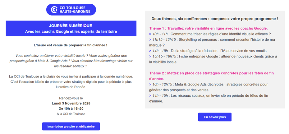 Les fêtes de fin d’année ne sont pas loin et la chambre de commerce de Toulouse offre une « journée numérique avec les coachs Google » pour booster la communication des entreprises sur META et GOOGLE ADS.