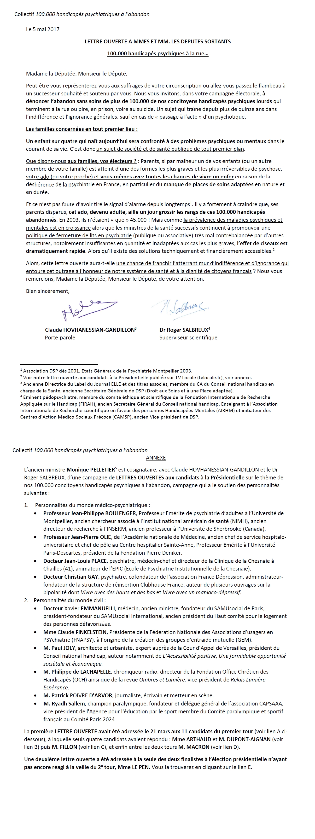 Après une campagne d’information auprès des candidats à l’élection présidentielle pour les alerter sur la question de l’abandon sans soins adaptés de plus de 100.000 concitoyens souffrant de psychoses graves, c’est maintenant au tour des 577 députés sortants, dont la plupart vont être candidats à leur propre succession, d’être alertés sur la déshérence de la psychiatrie en France, avec cette conséquence effarante que ces personnes handicapées psychiques n’ont comme perspective, une fois leur famille disparue, que la rue, voire la prison, au mieux l’exil en Belgique.